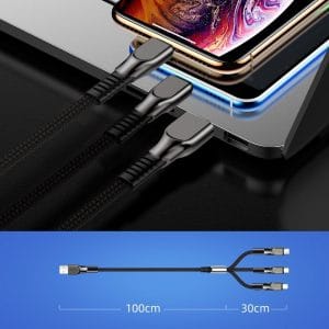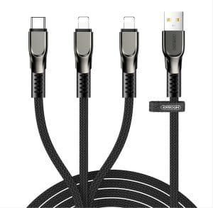 Joyroom 3in1 USB cable – Lightning / Lightning / USB Type C 3.5A 480 Mbps 1.3m black (S-1335K4) USB cable with 3 plugs: USB Type C and 2 x Lightning. A single cable that allows you to charge any equipment equipped with these connectors and transfer data, e.g. to and from a computer to a telephone. Perfect for people who have several devices from different manufacturers. One for all Perfect accessory for all devices with USB Type C and Lightning ports. Why do you need 3 cables when you only need one? Up to 3 devices at the same time The fight for priority loading is a thing of the past. 3 plugs allow you to restore the energy of up to 3 devices at the same time! Instant and safe charging The current of 3.5A and the pure copper cable guarantee fast and safe charging. Intelligent management chip It adjusts the appropriate voltage to a specific device, ensuring optimal and stable energy renewal. Your equipment will get exactly the amount of electricity it needs. Aluminum plugs Elegant and durable. Resistant to abrasion and oxidation. Even after many connections, they will still plug into ports smoothly and reliably. Nylon braid The cord is placed in a strong, nylon braid. Not only extremely durable, but also very pleasant to the touch. You don't have to worry about the entire cable being thrown away with an accidental tug. Specification Brand: Joyroom Plugs: USB / USB Type C / Lightning / Lightning Material: aluminum + nylon Current: 3.5A (max) Length: 1.3m Functions: uploading / uploading data