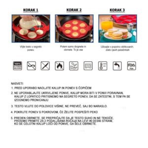 HRANA SE NE OPRIJEMA: Hrana se ne oprijema na model iz silikona med pečenjem, zato na zelo enostaven način vzamete gotove palačinke ali jajčka iz modela. Model ima ob robovih dve oprijemalni ročici za lažji oprijem modela, da se ne opečete.